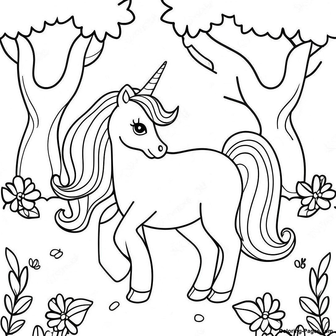 Fantasy Pegasus in a Magical Forest Coloring Page