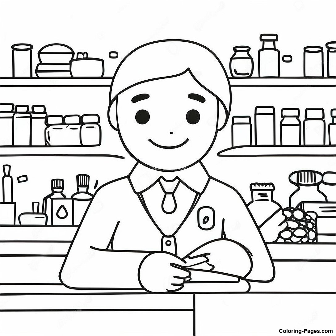 Download Printable PDF of Cheerful Pharmacist Behind Counter Coloring Page