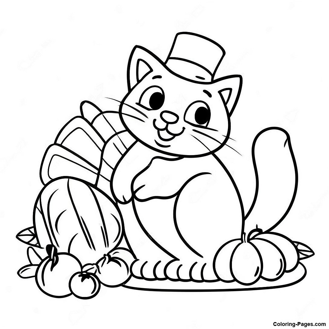Playful Thanksgiving Cat With Turkey Coloring Page