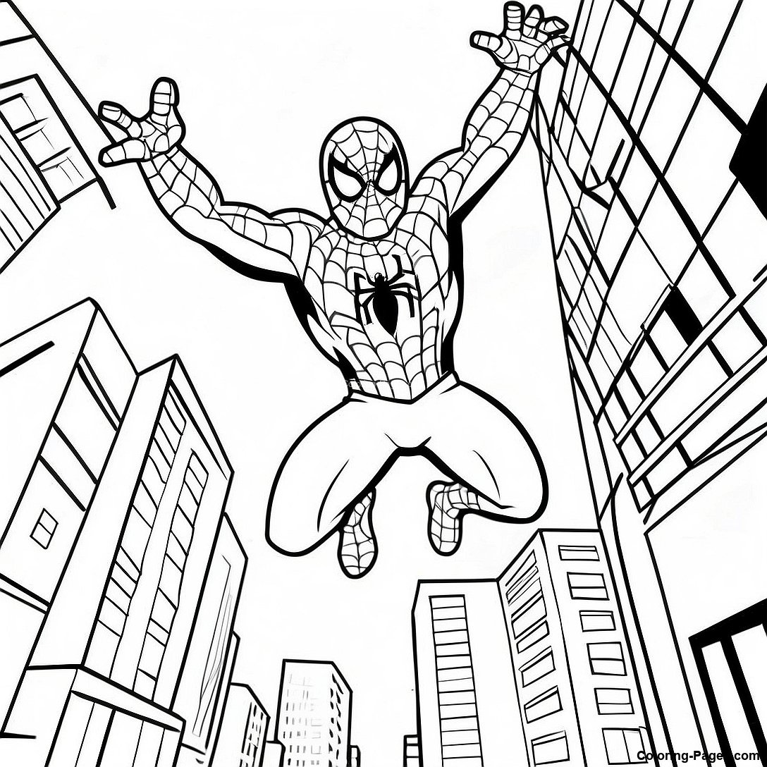Spider Man Swinging Through City Coloring Page