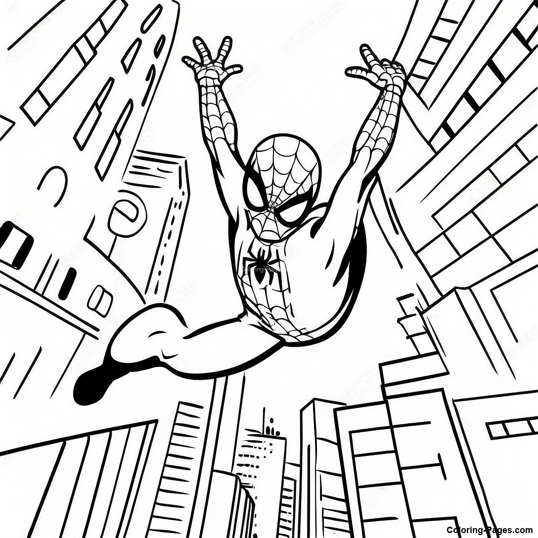 Spider Man Swinging Through City Coloring Page