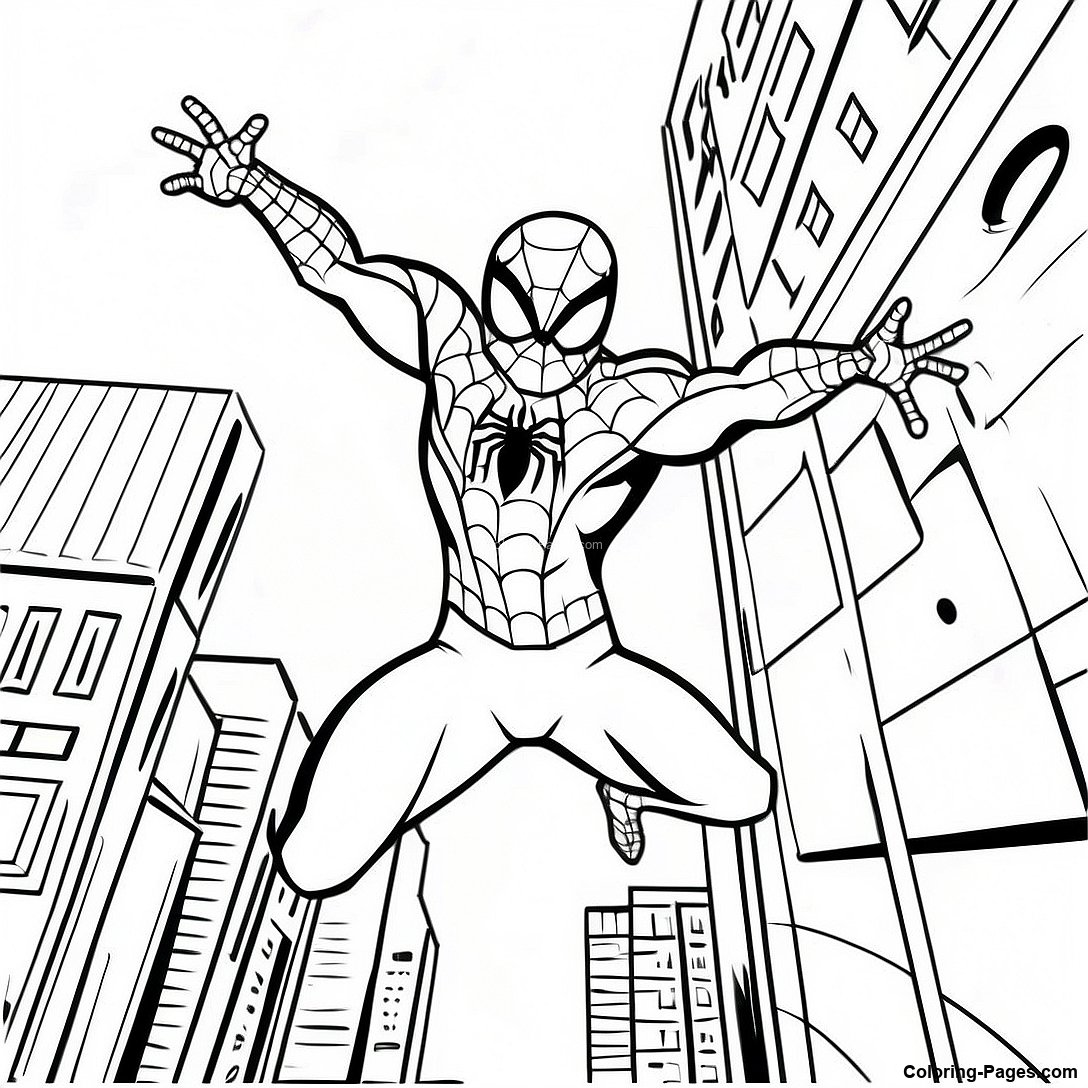 Spider Man Swinging Through City Coloring Page